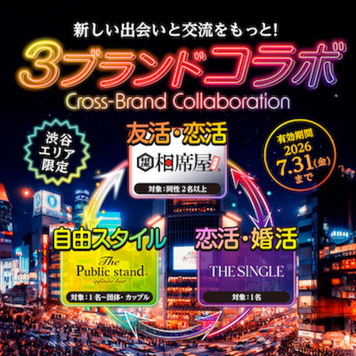 2026年04月01日 店舗情報 渋谷エリア限定!新しい出会いと交流をもっと! 3ブランドコラボ開催中 今夜の渋谷は、いつもより少しだけ特別になる 📅2026年4月1日(水)~2026年7月31日(金)まで 出会いも交流も、もっと自由に 渋谷の夜をアップデート 3ブランドがつくる新しい夜へ — 3ブランドを巡ってみよう — THE SINGLE 渋谷店 1対1で、じっくり話したい夜に 相席屋とは違う、1対1の出会いの場コラボカード提示でスタンプ1個(女性)¥1,000割引(男性) THE SINGLE 渋谷店へ › THE PUBLIC STAND 渋谷店 前後にも、気軽に立ち寄れる一軒 ひとりでもグループでも。深夜も安心コラボカード提示でスタンプ1個(女性)¥1,000割引(男性) 3ブランドコラボ詳細へ ›